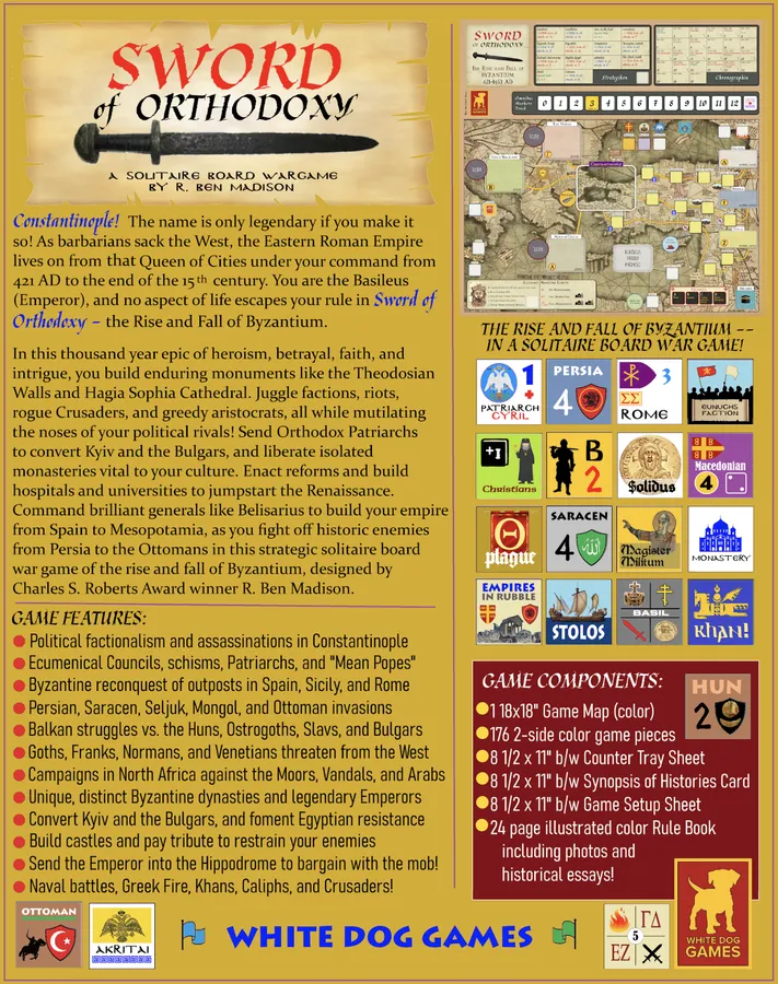 A solitaire game, Sword of Orthodoxy is designed by Charles S. Roberts Award winner Ben Madison, who also designed the following other White Dog Games titles: Global War, The Mission, The First Jihad, The White Tribe, Mrs. Thatcher's War, N, Don't Tread on Me, Gift of the Nile, Jeff Davis, Kaiserkrieg, and Gorbachev.