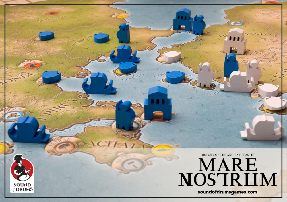 You will move your wooden meeples (representing legions, ships, armies and fleets) across a huge, beautiful illustrated map from the Iberic half island in the west to the Anatolian mountains in the east and Gallia in the north to the Nile Delta in the south.