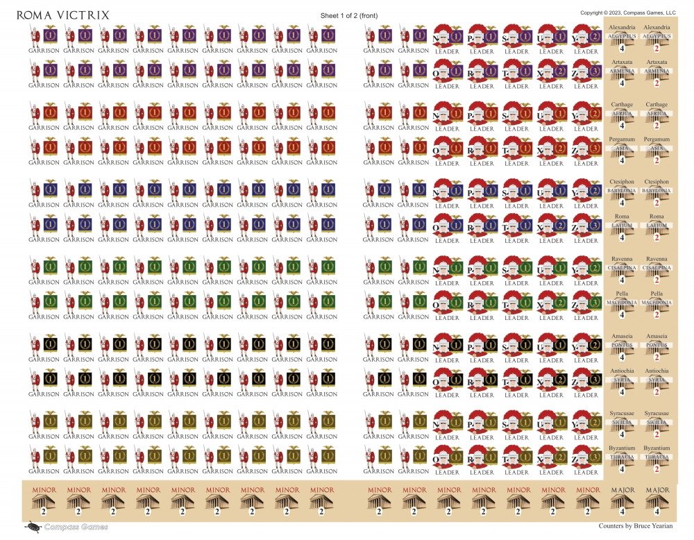 Roma Victrix is a game which endeavors to re-create the conflicts between Rome and her neighbors to achieve and maintain that dominance. A simple interactive sequence of play guides each player through the process of revenue collection, recruiting and maintaining military forces, conducting land and naval operations, diplomacy, field battles and sieges. Special rules are included to emphasize the importance and effects of leadership, cavalry superiority, mobility and attrition. Random events are also represented, adding an element of unpredictability to even the best laid plans and the likelihood that no scenario will ever play the same.