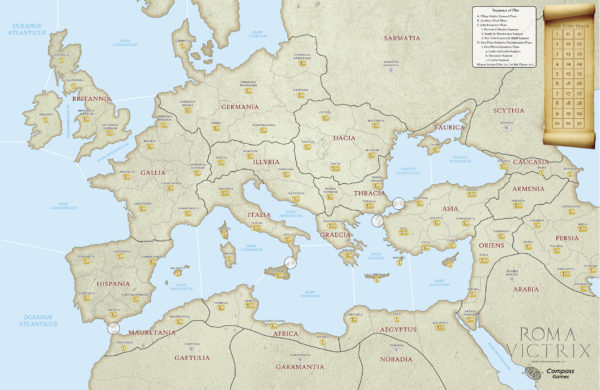 Roma Victrix is a grand strategic, moderate complexity wargame for 1 to 6 players, covering a time period ranging from 218 BC to 533 AD in twenty separate historical and hypothetical scenarios.