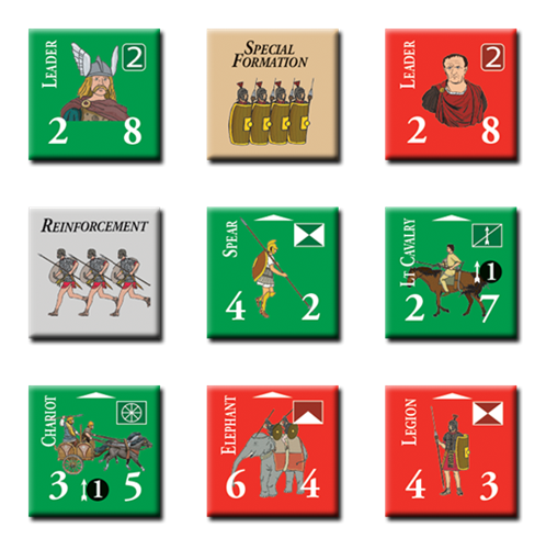Each hex on the map represents 100-200 meters across, depending on the battle. Each game turn represents 15 to 45 minutes, depending on the intensity of the action. Units represent three to five Roman cohorts, their equivalents, or amorphous groupings of irregulars (1,000 to 3,000 men, based on the era and efficiency of the army). Leaders represent single great commanders, war chiefs or the staff of a legion or other higher formation.