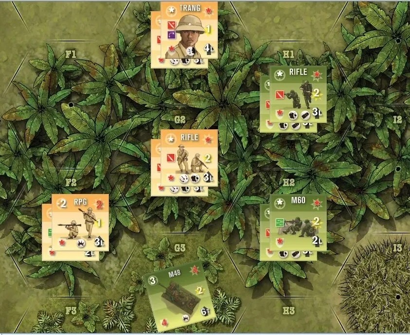 Fast, furious, and fun. Mark H. Walker’s Squad Battles series of games are known for their beautiful components and ease of play. A card driven game that stresses accessibility over mind-numbing complexity, ’65 Squad-Level Combat in the Jungles of Vietnam uses its cards to increase uncertainty and decrease the number of rules gamers need to remember. ’65 covers skirmishes from Ia Drang to Operation Starlight, and the players control U.S. Army Rifle squads, M48 tanks, M113 armored personnel, Hueys, North Vietnamese Sappers, RPD machine guns, and VC rifle squads as they attempt to outwit their opponents.