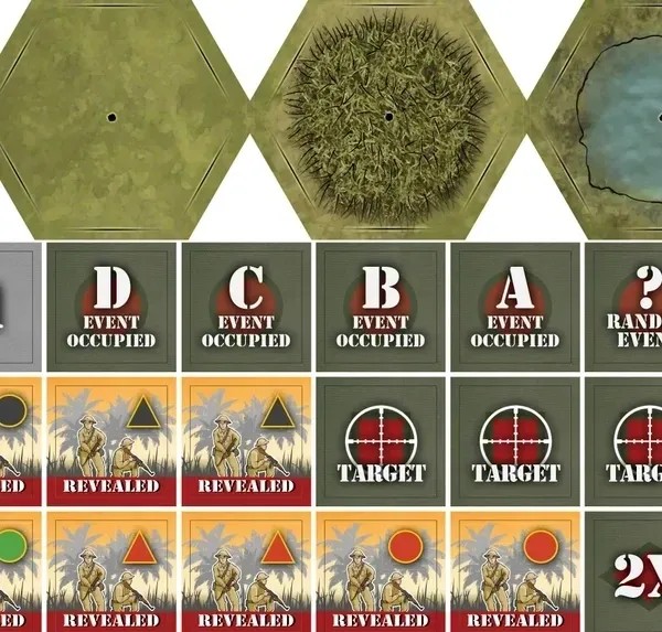 - One sheet of counters representing terrain, units, and mechanisms of the solitaire game.