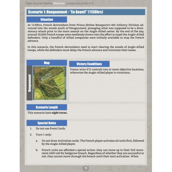 The Close Quarter Combat Waterloo Companion Book is the ultimate resource for players who prefer to engage in virtual warfare via Vassal, Tabletop Simulator, or our Digital DLC editions on Steam. Designed for convenience, this Companion Book includes the complete Module Rules and Scenario booklet found in the core board game—plus essential charts and tables—allowing players to experience the game without needing the full physical edition.
