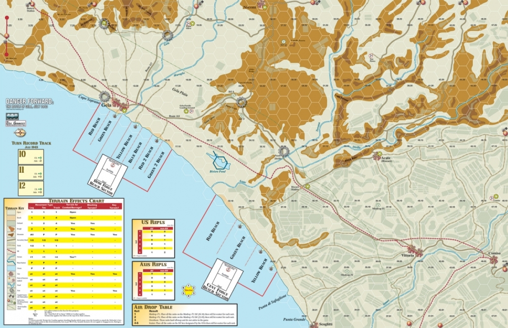 Danger Forward is a complete game covering the Battle of Gela that took place between 10-12 July, 1943 in Sicily. Following the initial landings of Operation Husky, the Italians and Germans were determined to throw the American forces back into the sea. They launched a vigorous attack that nearly succeeded, shelling the beaches with tank fire. The American ground forces, supported by the Royal Navy and US Navy offshore, fought hard to prevent defeat. Not resting on their laurels, the Allied forces had to push inland to secure ports and airfields to ultimately take the island. Taking Sicily quickly led to the invasion of Italy and ultimately the downfall of Mussolini. All of that hung in the balance based on the results of the fighting at Gela.