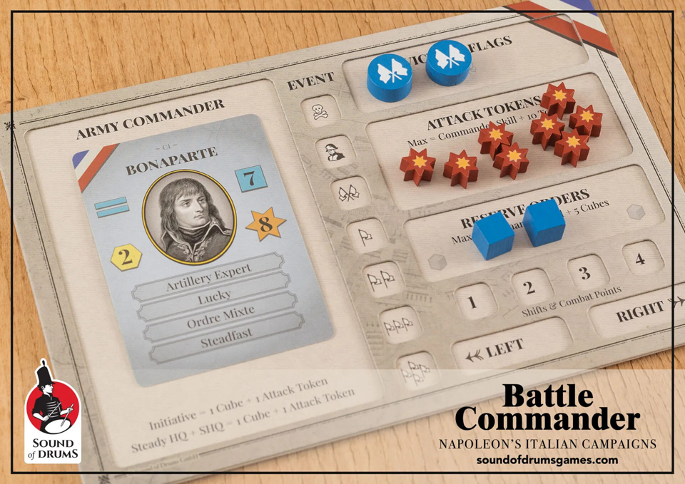 A persona card represents each Commander, his specific abilities and your Army’s resources; the all-important Subordinate Leaders are integrated in an innovative multi-role card system.