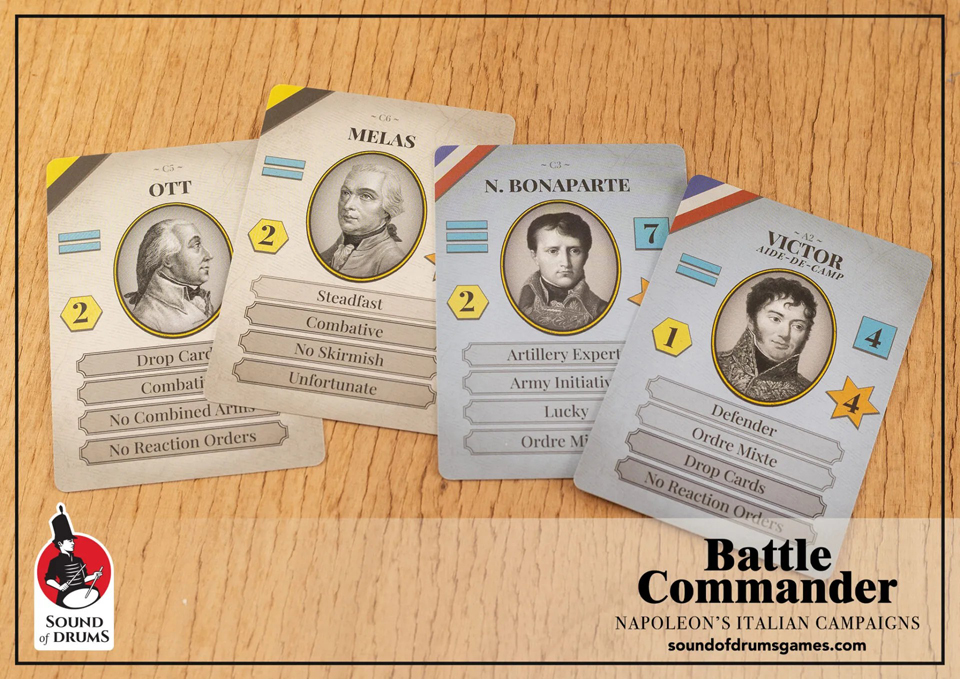 A persona card represents each Commander, his specific abilities and your Army’s resources; the all-important Subordinate Leaders are integrated in an innovative multi-role card system.