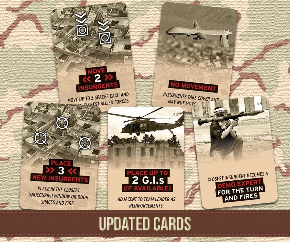 Le jeu peut être joué en solo, en coopération, en tête à tête à deux ou à trois joueurs. Utilisez les cartes pour déterminer les réactions des insurgés et la façon dont le danger sur le terrain évolue en un instant.