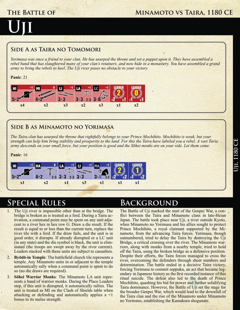 Ce quatrième pack d'extension comprend vingt nouveaux scénarios centrés sur le Japon médiéval, depuis le début de la guerre de Genpei jusqu'à la période Sengoku, afin d'accroître encore le plaisir et la jouabilité de Dawn of Battle. Les batailles incluses dans ce pack sont les suivantes